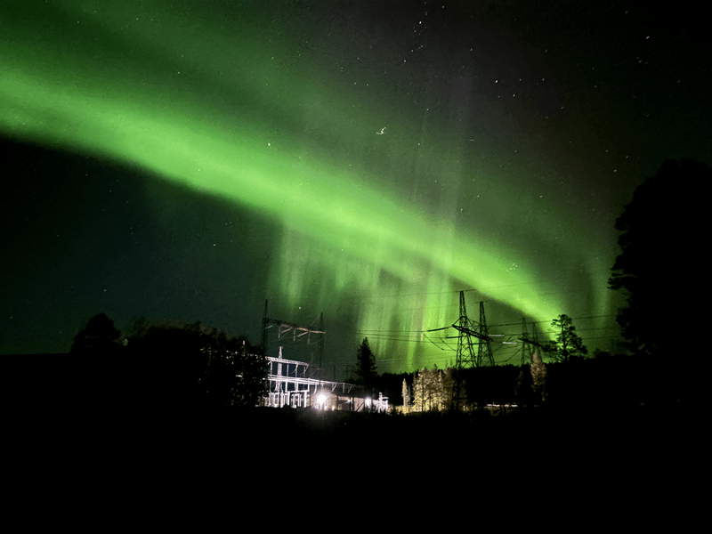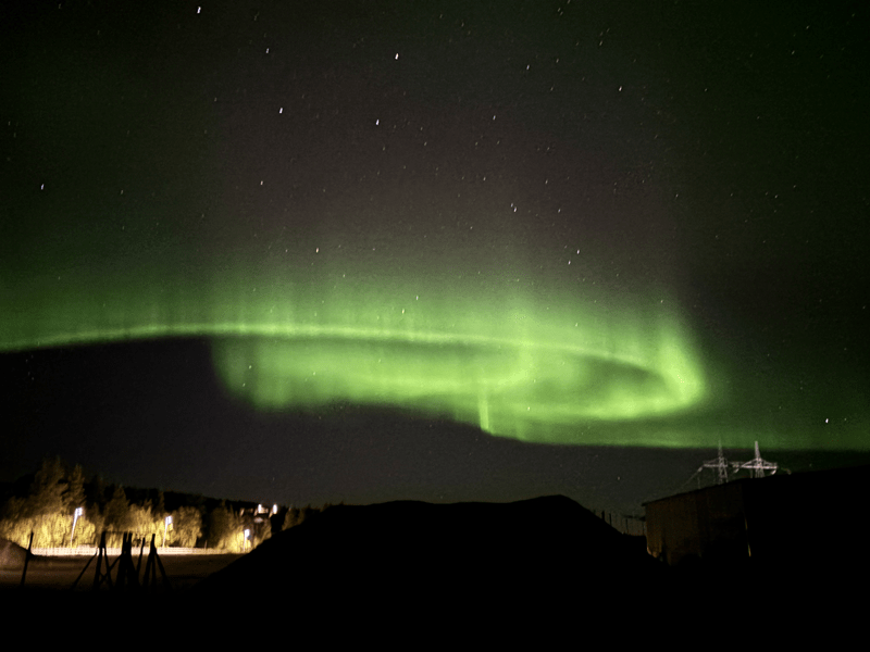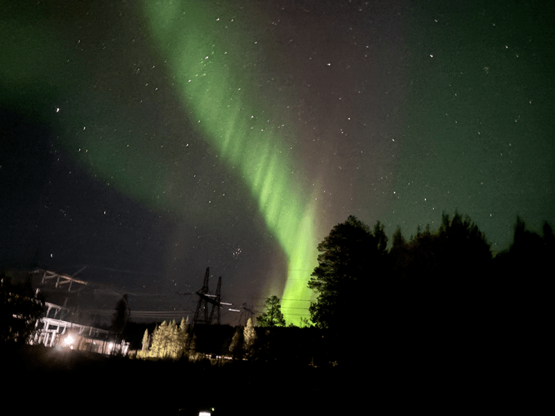 In der Zeit, in der Chrissi in Hilde rumwuselt, kommen in der Aurora App die ersten Meldungen zu möglichen Polarlichtersichtungen rein. Immer wieder gibt das Handy einen Alarm raus, weil die Werte immer weiter steigen und leichte Polarlichter vorausgesagt werden. In Porjus sollen wohl die möglichen Sichtungen am besten sein. Noch während des Abendessens reift der Plan, Chrissi ist da schon etwas aufgeregt 😊, doch noch mal loszufahren. Es sind nur 45 KM und die Strecke ist nicht all zu schwer zu fahren. Als es anfängt dunkel zu werden, „legen“ wir ab. Es geht rauf auf die E45 und immer gen Norden. An den Seen und über die Sperrwerke von Harrauden und Aspudden bis Porjus Vattenkraftstasion. Da fahren wir runter von der E45 und suchen unseren Lieblingsplatz vom letzten Jahr auf. Leider ist der schon besetzt und in der unmittelbaren Nähe ist kein schöner Beobachtungsplatz zu finden. Traurig beschließen wir das Ganze abzubrechen und zurück zu fahren. Lichter waren auch keine zu sehen und so ziehen wir wieder ab. Bevor wir aber endgültig zurückfahren, machen wir noch einen Versuch am Harspranget-Kraftwerk. Hier gibt es einen Parkplatz, den wir schon mal genutzt haben. Kaum das wir stehen – wir mussten uns noch richtig positionieren – entdecken wir einen leichten grünlichen Schimmer am Himmel. In der Zeit, in der Chrissi ihr Equipment zusammensucht wird der Schimmer immer stärker. Dann ist sie endlich fertig und stürmt raus. Keine Sekunde zu früh. Das Spektakel manifestiert sich in all seiner Pracht. Grüne Streifen diagonal am Firmament formen sich zu immer neuen Strukturen. Ich beobachte das Ganze aus dem Sky-Fenster. Die Zeit vergeht wie im Fluge und irgendwann lässt das Schauspiel nach. Chrissi packt zusammen und kommt leicht durchgefroren wieder rein, es waren immerhin -1 Grad. Noch völlig aufgekratzt setzen wir unsere Rückfahrt fort. Die Straße ist leer, nur hin und wieder kommt uns ein LKW entgegen. Sie sind schon von weitem anhand ihres „Fernlichts“ zu erkennen, da sie ihre Umgebung fast in Tageslicht tauchen. Wenn sie uns bemerken, blenden sie ab. Das klappt super.