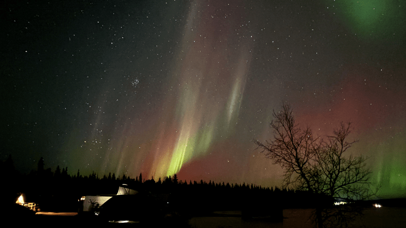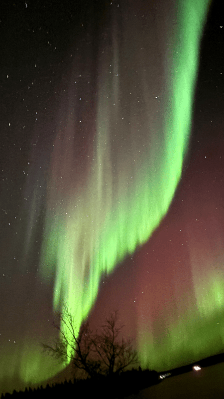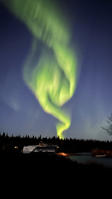 Der nahe ICA kommt da wie gerufen. Dann über die E10 nicht einmal 20 Minuten später kommen wir an der Rezeption vom Platz an. Die Formalitäten sind schnell geklärt und wir können Hilde am See, direkt am Wasser, hinstellen. Mit der Front zum Wasser steht es sich super. Nachdem alles eingerichtet ist, nehmen wir die Campingstühle und setzen uns ans Wasser. Die Sonne wärmt uns und der Blick aufs Wasser, in dem die Sonnenstrahlen glitzern, ist wunderschön. So kann man es aushalten. Schnell vergeht die Zeit am Nachmittag und der Abend nähert sich mit großen Schritten. Die Sonne ist bereits hinter dem Horizont verschwunden. Das Abendessen ist schmackhaft und üppig. Vorbereitungen für die „Nacht-Show“ laufen. Nordlichter sind angekündigt und somit müssen Stative und Kameras vorbereitet werden.