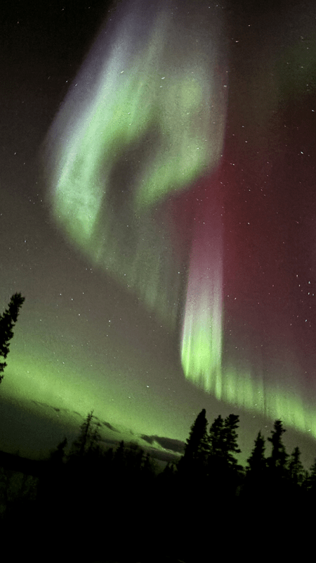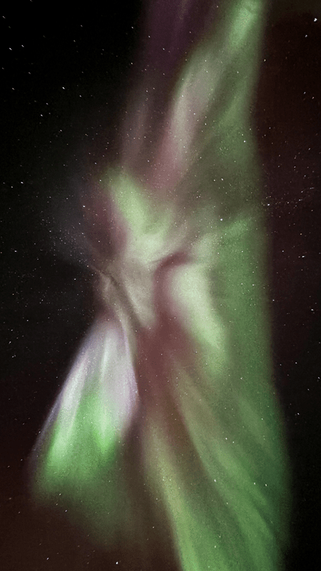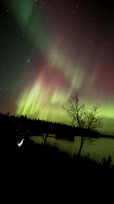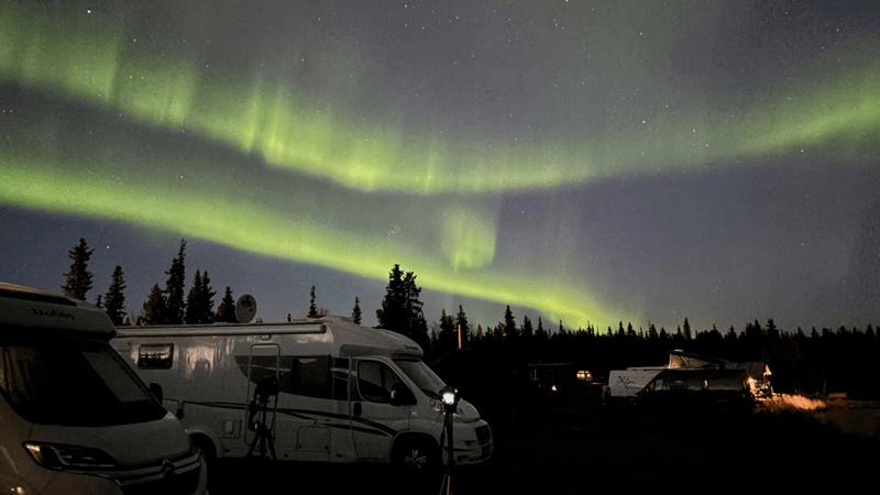 Mittlerweile ist es 21:00 Uhr und stockdunkel. Langsam schleicht ein grünlicher Schimmer am Firnament empor und dann explodiert der Himmel. Das Schauspiel ist unbeschreiblich. Zeitgleich kommen auch die anderen Camper aus ihren Fahrzeugen und richten ihre staunenden Blicke gen Himmel. Und Chrissi, die ist wieder voll in ihrem Element. Und ich, ich sehe mir das Ganze direkt an. Ohne Kamera – bis ich wieder rein gehe und mir das Schauspiel durch das „Sky-Window“ ansehe. Es wird immer später und ein Ende ist nicht abzusehen. Das Bett ruft und ich beginne mit den Vorbereitungen zur Nacht. In der Zwischenzeit werden die Lichter weniger, bis sie ganz aufhören. Chrissi kommt rein, durchgefroren, aber zufrieden.