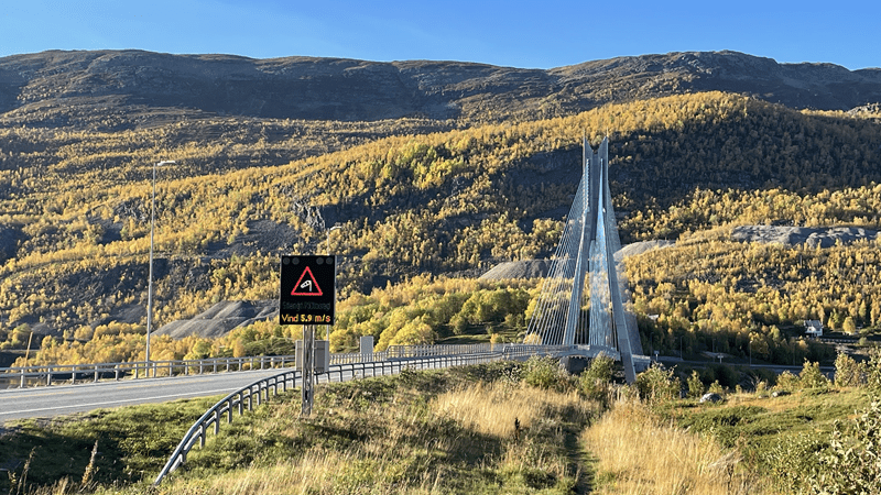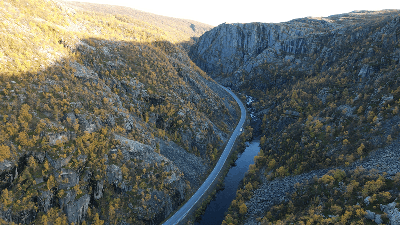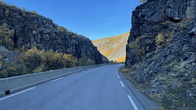 Und los geht sie, die Fahrt nach Alta. Die 145 km auf der E45 führen uns durch verschiedene Topologien. Höher gelegen als der Meeresspiegel, dennoch durch eine Ebene. Dann geht es durch Canons, durch die Straße mit unterschiedlich Steigungen, teilweise von 14%. Hilde kommt damit gut klar und schiebt sich immer weiter voran. Links und rechts die Felswände und neben der Straße ein Bach. Absolut wunderschön das Ganze. Nach einer Weile „spuckt“ uns der letzte Canon aus. Wir fahren durch hügeliges Gebiet und drei weitere Tunnel – das Wetter ist super.