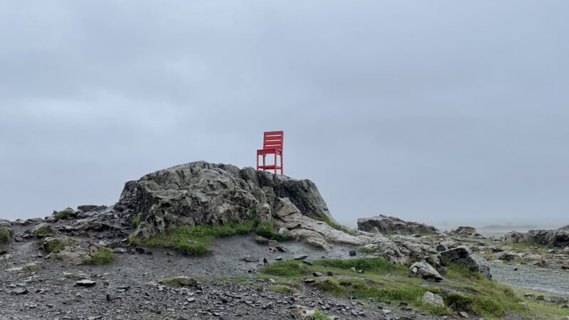 Ein weiterer Hingucker steht noch auf dem Plan, der „Rote Stuhl“ mitten im Nirgendwo. Zwischen Höfn und Stafafell direkt an der Ringstraße 1 steht auf einem Felsen ein großer roter Stuhl. Ein Outdor-Kunstwerk (#longuesthouse #redchairiceland) lädt zum Fotografieren ein. Wir halten auf einer Fläche aus vom Wasser rundgeschliffen Steinen. Mittendrinn ein Fels auf dem ein roter Stuhl eingelassen ist. Als wir abfahren wollen merke ich, dass die regennassen Steine für Hilde kaum Gripp haben. Die Vorderräder fräsen sich förmlich bis hinauf zur Straße. Ohne stecken zu bleiben kommen wir wieder auf Asphalt. Puh, das war ja mal was.