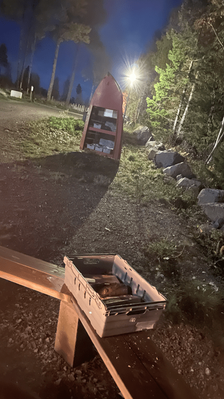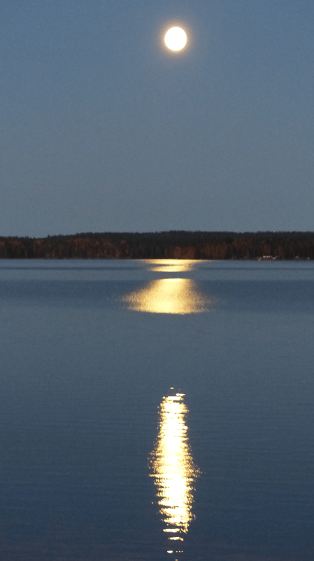 Am Abend machen wir dann Feuer, Holz kann man von hier beziehen. Auch dafür gibt es die altbekannte Kasse des Vertrauens – Briefumschlag für den Geldeinwurf. Der Himmel ist klar und der Vollmond leuchtet über dem See. In der Ferne sieht man das Licht der Stadt Hudiksvall. Still ist es heute nicht. Das Getröte der Graureiher schallt über den See. Aufgeregtes Geschnatter zeugt von einiger Unruhe unter den Tieren. Wir genießen das Feuer und machen Fotos. Nach einiger Zeit bemerken wir eine Nebelwand, die aus Norden über den See kommt. Fasziniert beobachten wir das Schauspiel und ehe wir uns versehen, können wir nicht mal bis zu Hilde sehen. Nichts ist zu hören, nicht mal die Graureiher. Das Feuer lodert vor sich hin, knistert und vermittelt Sicherheit. Die Situation unwirklich.