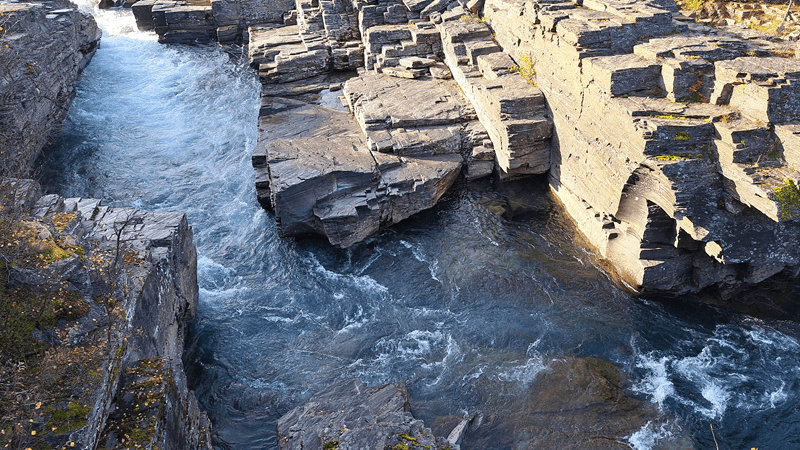 Und da ist er auch schon, der Kungsleden, der am Canon entlangführt. Den kennen wir noch vom letzten Jahr. Diesmal wollen wir auf der Sommerroute nur die Stromschnellen entlang bis dahin, wo der Fluss noch ruhiger ist und durch ein Schotterbett fließ. Es ist etwas feucht und rutschig und wir müssen aufpassen. An den steileren Kanten gibt es ein Geländer, das eher an einen Handlauf erinnert. Sollte man wegrutschen fällt man unten durch. Wieder wecken die Bruchkanten, unter denen das Wasser sich seine Bahn sucht, meine Aufmerksamkeit. Das Licht scheint anders als beim letzten Mal. Natürlich werden viele Bilder und Videos aufgenommen.