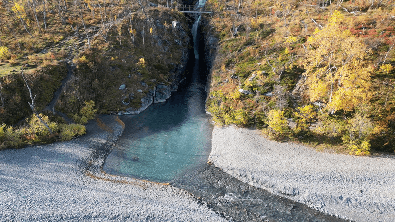 Da wir nicht über die norwegische Grenze wollen drehen wir bei nächster Gelegenheit. Wir fahren noch mal an den „Silverfallet“ und machen lieber noch ein paar Aufnahmen mit der Drohne.