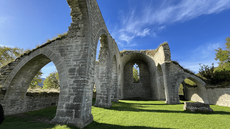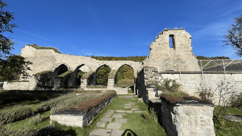 Kamera und Drohnen geschnappt und los geht der Ausflug. Zur Ruine kommen wir an einigen Schautafeln vorbei auf denen die Geschichte des Klosters beschrieben wird. Auch in deutscher Sprache.